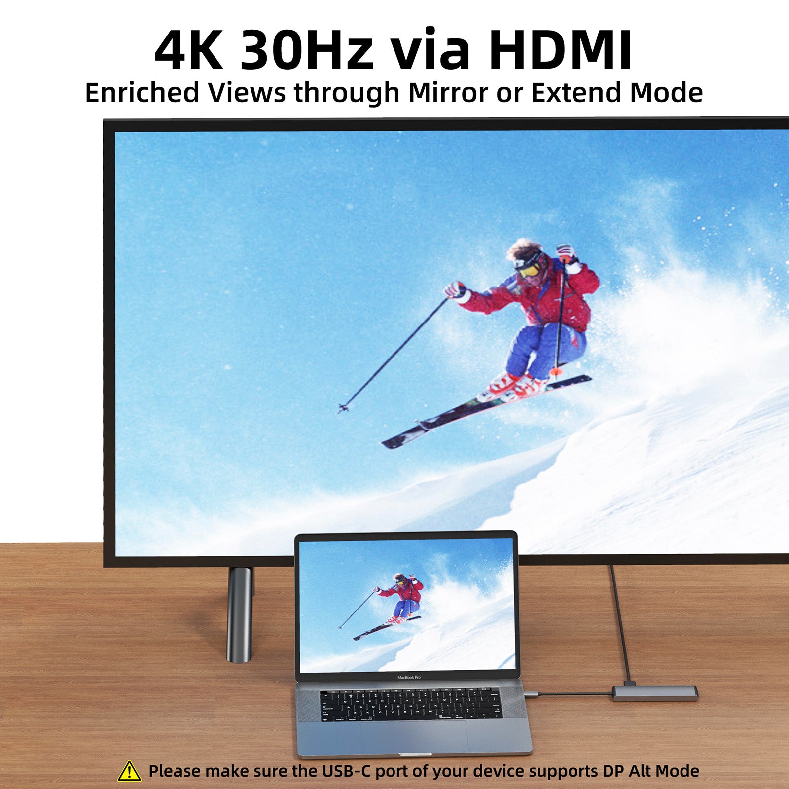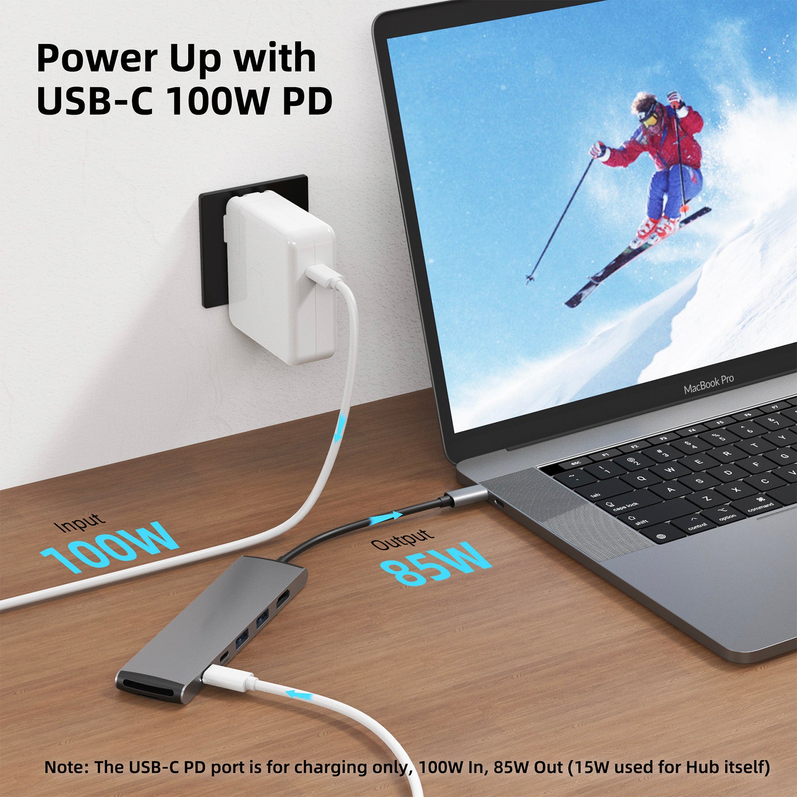 USB Hub with 1* HDM port, 1*100W USB-C Power Delivery (PD) input port, 1* USB-C and 2 *USB 3.0 5Gbps data ports, 1*MicroSD card slot, and 1*SD card slot, multiport connectivity to satisfy all your expansion needs, and provide your work efficiency at home ,in the office or on the go.